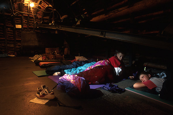 their sleeping bags during a