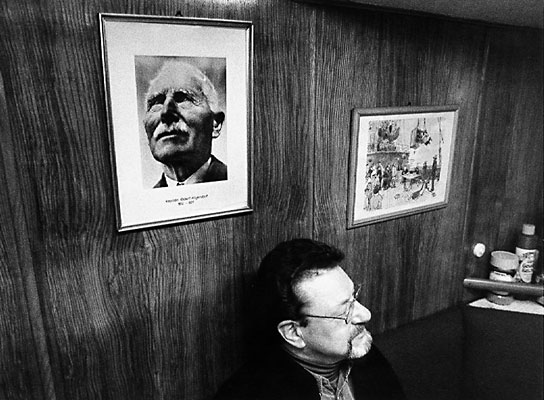 DEVIL OF HAMBURG Beneath a portrait of the man his ship was named after, captain Jürgen Bienert lounges in the officers mess. Due to the fact that his ship, the Potosí, carried saltpetre from Chile to Hamburg in record time, Captain Robert Hilgendorf was a legend even in his lifetime. |