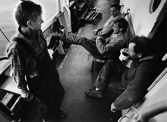 BREAK During their watch sailors Achim Dittmann, Horst Schröter, Ralf Liebegut and Jens Beckröge take a coffee break. They work two shifts at four hours each around the clock, transferring pilots to and from the big freighters in a small open shuttle. |