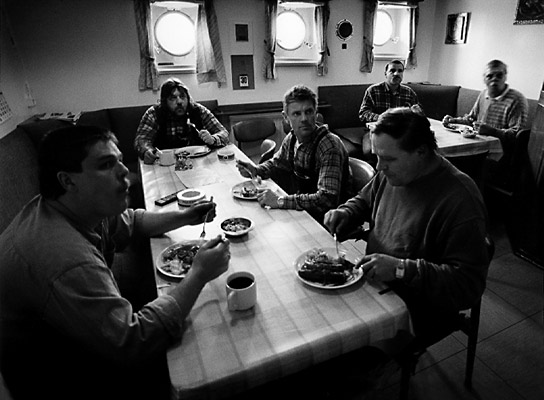 BREAK In the sailors mess the TV set runs non-stop and turns the heads of the men of the off-duty watch even as they take their lunch. From left to right Thomas Thoede, Ronald Rolli Langewitz, Achim Dittmann, Horst Schröter; at back: Michael Fischer and engineer Peter Soboll. |