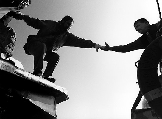 RISKY BUSINESS The little shuttle from the Kapitän Hilgendorf has pulled alongside the stern of seabound hydrofoil Dolphin to pick up pilot Hans-Wilhelm Lühders. Sailor Michael Fischer (at right) gives him a hand in this risky manoeuvre.