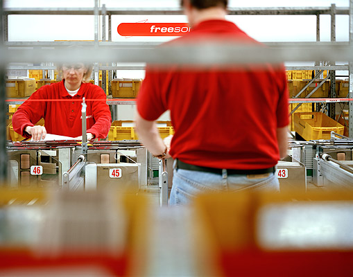 SORTING CENTER At a sorting center in Düsseldorf, employees sort commercial letters according to the region of delivery. Most freesort employees are hearing impaired.