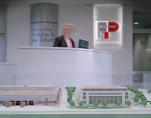 RECEPTION DESK Christiane Bengsch at the reception desk in the lobby of the FP administration building. At front a scale model of factory building and administration.