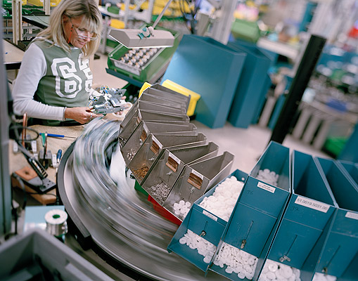PARTS IV Production of franking machines: Heike Ohlbrecht assembling printer units for the ‘optimail 30’ model.