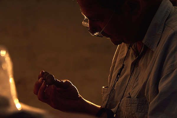 TELLING TREASURE Supervising excavator Hans- Georg Hüttel scrutinizes fragments of votive Buddha statuettes from burnt clay that have been found in the ruins of Karakorums palace.