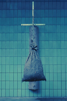 SUMATRAN TIGER (Panthera tigris sumatrae) scratching log and straw-filled hemp sack hanging from chain; Frankfurt zoo, Germany