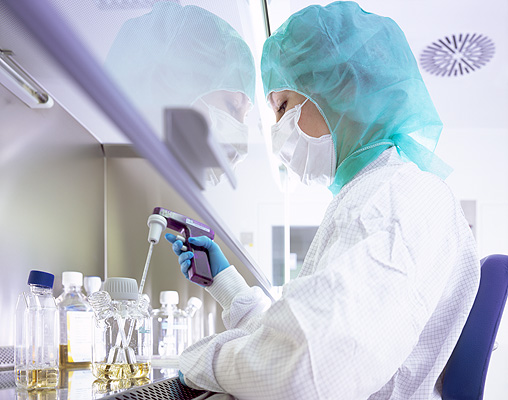 SEED LAB Genetically modified hamster cells thrive and multiply in special nutri- tive media at 37°C in incubators. They have to be kept in constant motion. In the seed lab they are transferred to larger vessels once every two days.
