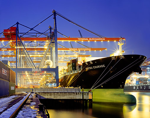 GIANT ON A LEASH Huge portainer cranes loading and unloading container ship HATSU COURAGE, 334 m long, moored at Burchardkai in the Port of Hamburg, Germany.