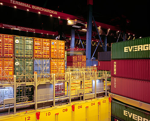 CARGO HOLD Huge portainer cranes in the Port of Hamburg load and unload container ship HATSU COURAGE. At front: cargo hold with guide rails and hatch cover.