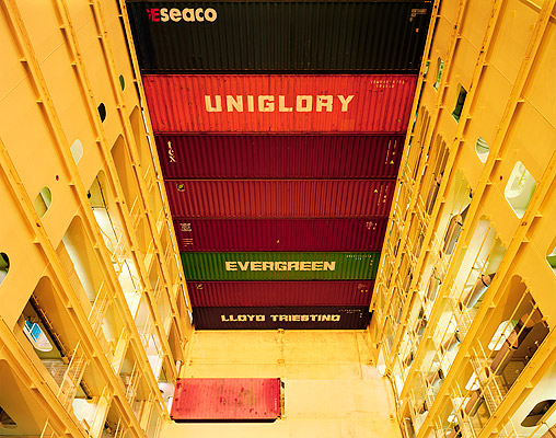 DOWN THE HATCH Nine containers can be stacked on top of each other below deck inside the cargo hold of container ship HATSU COURAGE.