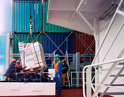 GROCERIES During docking time in the Port of Hamburg, Filipino seamen of con- tainer ship CMA CGM VERLAINE accept a delivery of groceries for the ship’s cook.