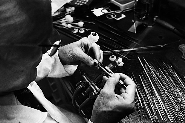 MEASURING Alfred Greiner uses an old glass eye which matches the eye hollow of the patient as a model to help him shape the desired individual fit of an artificial eye. With a pair of dividers he transfers measurements from one to the other.