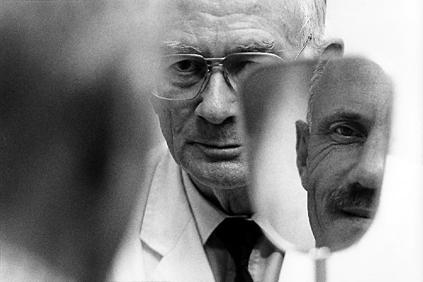 GOOD WORK Ocularist Alfred Greiner has his patient Manfred Kerber look in the mirror to check out the fit of his new custom-made eye prosthesis.