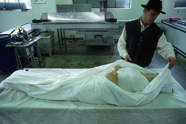 examines the corpse of a
