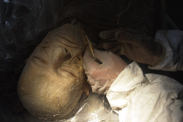 PREPARATION In order to expose certain anatomical features the plastinated body of a woman is designated to display, Chinese guest scientist Xiangyu Kong dissects the corpse which is preserved in alcohol prior to plastination.