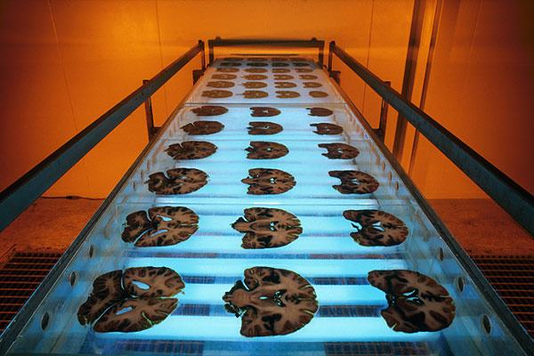 UV-CURING Slice plastinated brain slices undergo curing with ultraviolet light at the Institute for Plastination. The 18 slices in the front show severe haemorrhage which killed the person (black stains).