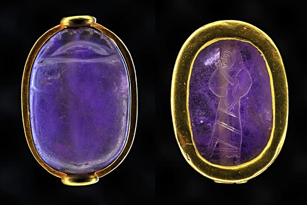 SCARAB SEAL Amethyst scarab seal in a gold setting. The piece was found in chamber 1 of the royal tomb. The engraving shows a woman dressed in a Syrian garment with a veil or hood. 0.94" long, 15th/14th century BC