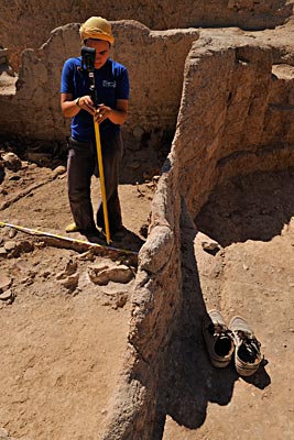 SOCK-FOOTED SCIENCE In room DK, Stephanie Döpper helps measuring finds with prism and total station. In some of the rooms, the archaeo- logists have to take off their shoes in order to preserve the situation.