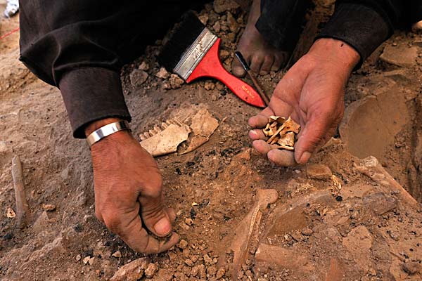THE BONE COLLECTOR With brush and trowel, foreman Fares Khellu gathers bones from the ninth layer of animal bones and potsherds in room DK. 80% of the bones are sheeps’ bones, the rest are from goats, cattle and gazelles.