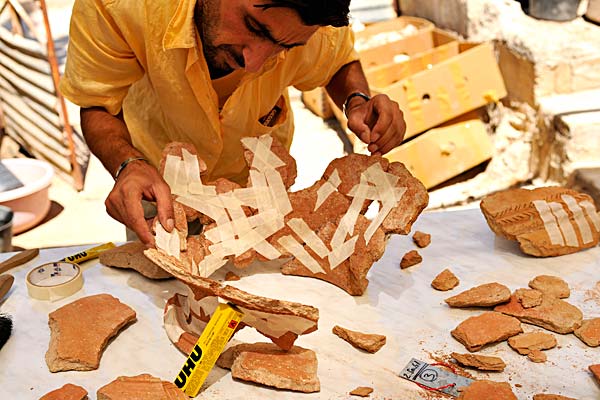 CONSERVATION Majid Khellu tries to piece together the ornamented fragments of a large storage vessel discovered north of the royal tomb.
