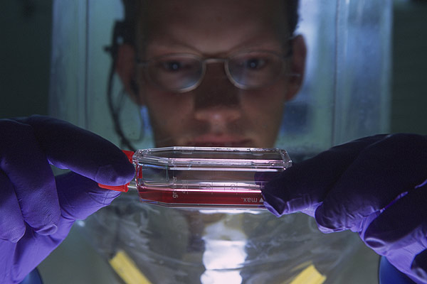 The cover editors of German news magazine DER SPIEGEL wanted a spooky image from inside the L4 lab. Naturally, I wasnt allowed inside the lab, so I had to shoot through a small window in a door. The light was bad and I couldnt use any studio lighting equipment because every item that enters the lab either stays there or has to be sterilized on leaving it. I resorted to a tiny slave flash which I sealed inside an airtight container which was then taped to the door under the window by the guys in the space suits. |