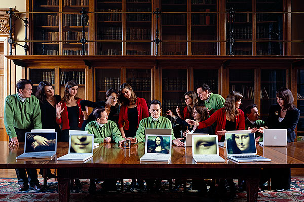 | >> This was part of a GEO picture story on Leonardo da Vinci. The original idea of a group portrait with 13 different persons proved unrealistic, so I switched to the more unusual concept of having three persons pose repeatedly in different positions. The time frame for the shoot was extremely narrow, 75 minutes, a fact which caused me a couple of sleepless nights prior. Digital composition of the five 4x5" exposures took me another two days at the computer. Photos available through: VISUM |