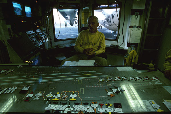 FLIGHT DECK CONTROL The aircraft handler lays down the parking positions of aircraft before, after and in between missions. Miniature airplanes on a scale model of the Stennis flight deck make this task easier.