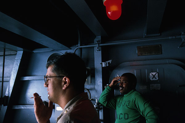 SMOKING SPONSON Aboard aircraft carrier USS John C. Stennis smoking is strictly prohibited. With one exception: smoking sponson, a balcony-like open platform below the flight deck, is often crowded with smokers. The red lamp is a night light.