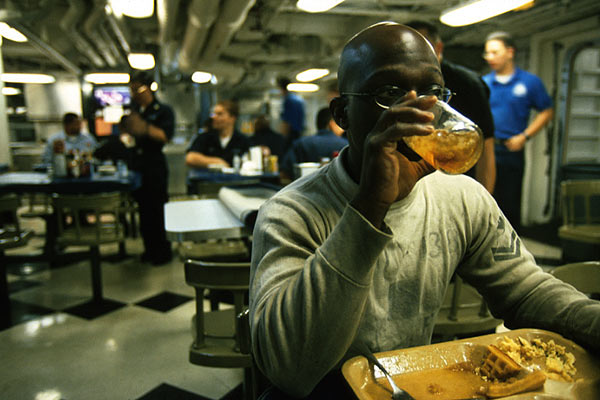 NO SMOKING, NO ALCOHOL The majority of the crew members onboard aircraft carrier USS John C. Stennis take their meals on the enlisted personnels mess deck. Alcohol is not sold.