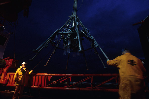 MULTIPLE CORER At dawn crewmen launch a multiple corer to probe a vent at Hydrate Ridge. The video controlled TV-MUC is designed to collect up to 8 short sediment cores from the seafloor.