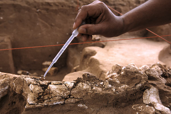 SAVING BRITTLE BONES A paleontologist uncovers the forearm of an ice age hippopotamus and puts drops of a polymer solution on the brittle bones for preliminary preservation.