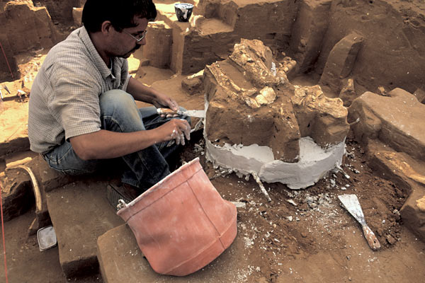 PLASTER JACKET Preparator John-Albrecht Keiler provides the fossil forearm of an ice age hippopotamus lodged inside a sediment block with a protective plaster jacket for transport.