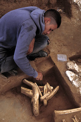 SURGICAL REMOVAL In order to provide it with a protective plaster jacket for transport, preparator Michael Stache undercuts a tangle of deer mandibles and other ice age bones lodged in sediment.
