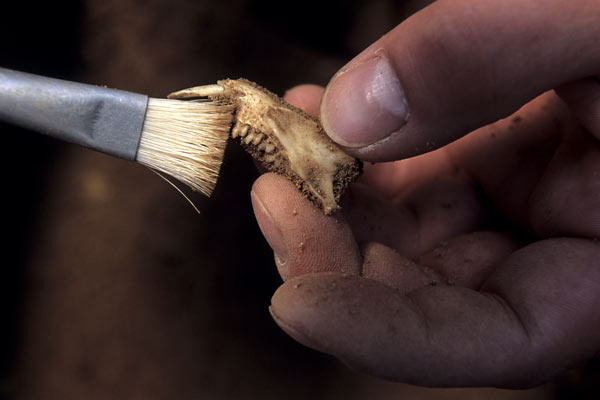 DENTAL HYGIENE A preparator cleans a mandible of an ice age Spermophilus ground squirrel with a brush.