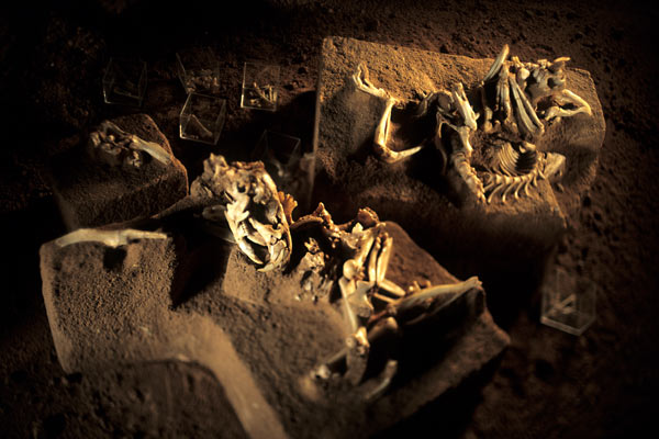ULTIMATE FILIGREE Two almost complete fossil skeletons of a giant hamster at front and a ground squirrel embedded in blocks of sediment and dressed for display.
