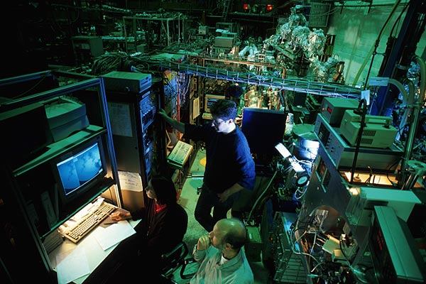 AT WORK With an X-ray microscope at the BESSY electron synchrotron in Berlin, physicists Jürgen Thieme and Claudia Schmidt investigate flocculation processes which play a major role in water treatment. The process in a tiny water sample shows on the monitor in realtime. |